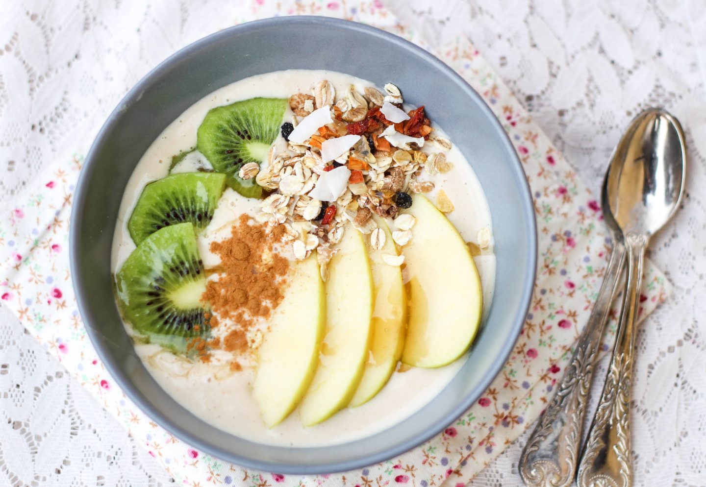 Versa il composto in una ciotola, decora con fettine di mela e kiwi, muesli, miele e una spolverata di cannella.